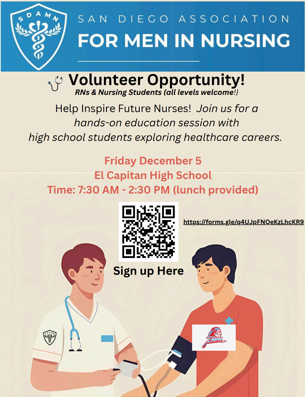 Another opportunity for the San Diego Association for Men in Nursing to help shape the future generations of nursing and healthcare workers in San Diego. Most children have seen a blood pressure cuff and a sphygmomanometer, but how many know how it works or can even pronounce it for that matter. In collaboration with Grossmont Unified High School District Health Career Pathways, we have created some comprehensive, creative, and engaging curriculum to bring Blood Pressure measuring and understanding to our local high school health career pathways students.
